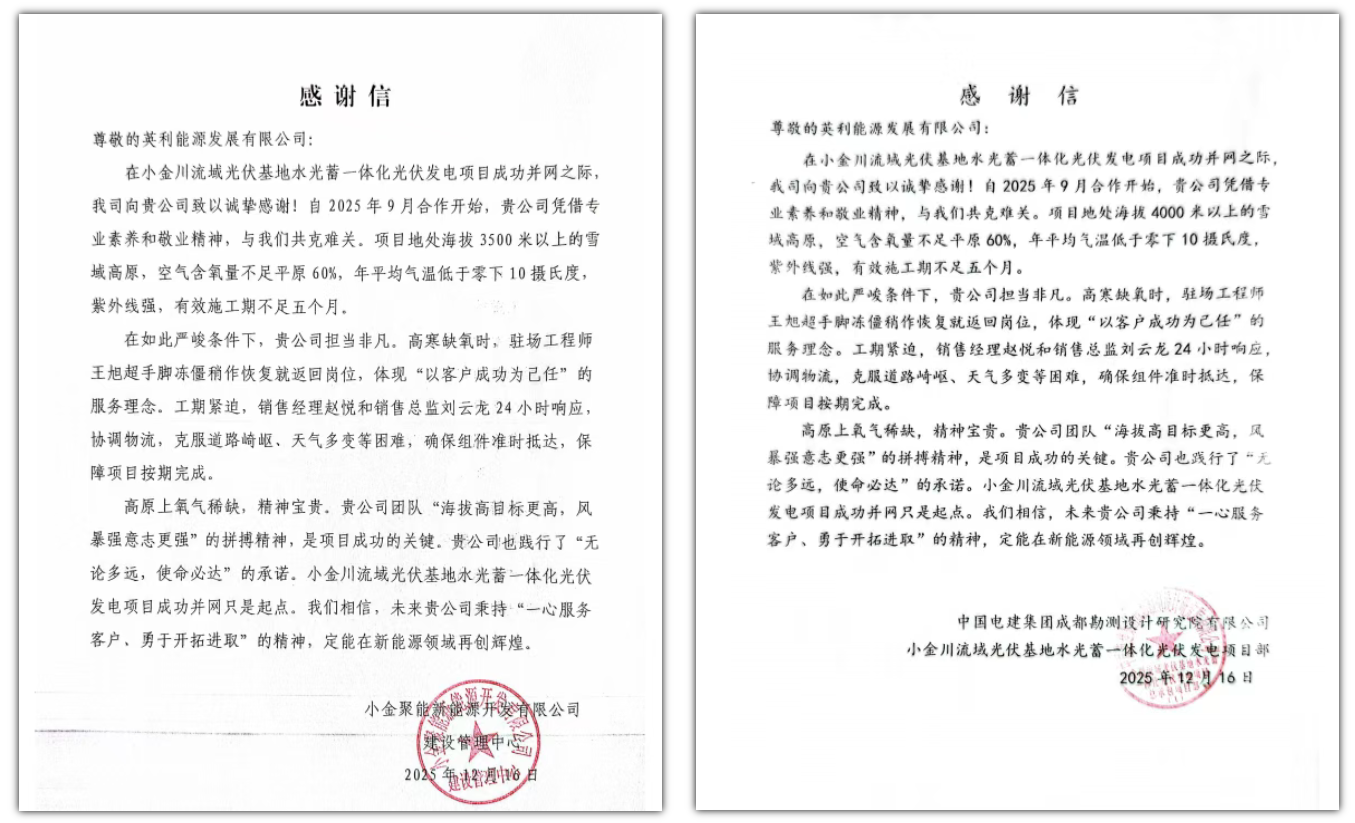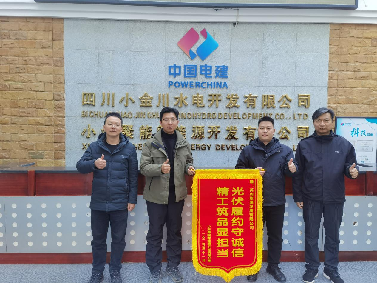 優(yōu)質(zhì)產(chǎn)品和高效服務(wù)也獲得客戶高度認(rèn)可。項(xiàng)目業(yè)主方小金聚能新能源開發(fā)有限公司、項(xiàng)目總包方中國電建旗下中電建水電開發(fā)集團(tuán)有限公司均發(fā)來表揚(yáng)信;業(yè)主更贈(zèng)送一面錦旗以示高度贊譽(yù):“光伏履約守誠信 精工筑品顯擔(dān)當(dāng)”。
